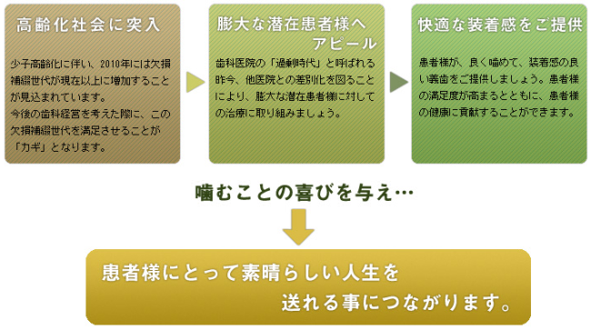 「義歯のチェアータイムをより短く」をモットーに(出来るならば咬合調整なしを目指して)、印象採取、咬合採取の時間短縮、正確さ、咬合調整を少なくするシステムで制作しています。